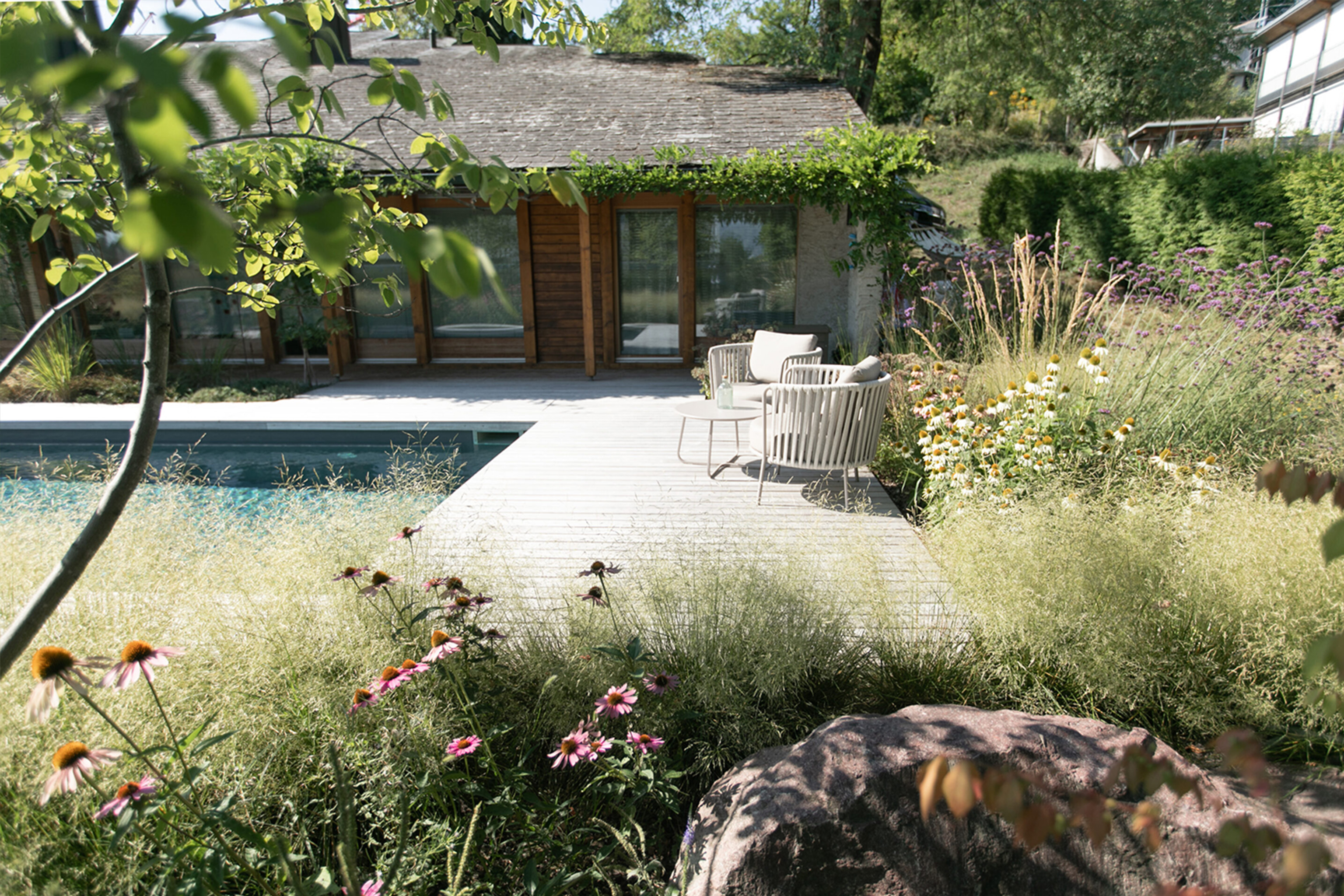 Ein naturverbundener Grünton prägt den visuellen Auftritt entscheidend. Zwei harmonische Farbtöne in Altrosa und ein weiches Beige komplettieren die Farbpalette.